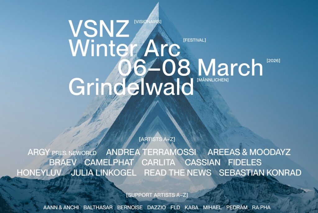VSNZ Winter Arc propone tre giorni di musica elettronica in alta quota, con una line-up che propone Argy, CamelPhat, Carlita, Fideles, HoneyLuv, Cassian, Julia Linkogel e Sebastian Konrad; sede principale del festival sarà la Männlichen Bergstation, punto di arrivo degli impianti di risalita a 2.225 metri d’altitudine, così come non mancheranno gli after party ufficiali a Grindelwald.