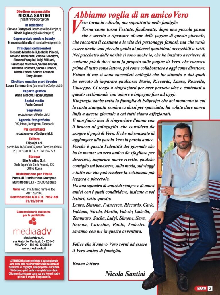 Domani, giovedì 6 giugno 2024, Vero farà il suo atteso ritorno nelle edicole dopo una breve pausa dovuta al passaggio di proprietà dalla precedente casa editrice al gruppo romano Ediprojet, con Nicola Santini, che ora ne ha assunto il pieno controllo.